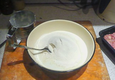- Zeef de bloem in een diep bord door een fijne zeef. Voeg hieraan zout, suiker en droge gist toe. Je kunt een beetje plantaardige olie toevoegen om het deeg zachter te maken.