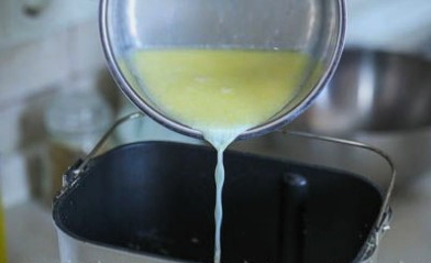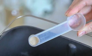 - Je kunt zelf gistdeeg maken of in een broodbakmachine. Als we de tweede optie gebruiken, laden we eerst droge ingrediënten in de container. We beginnen met gist.
