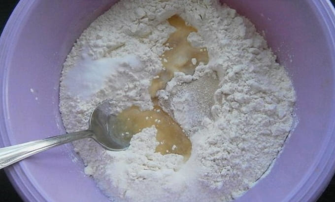 - Meng in een diepe kom de helft van de bloem, suiker, zout en zachte boter. Vul het voedsel met een half glas kokend water. Roer de massa goed door.
