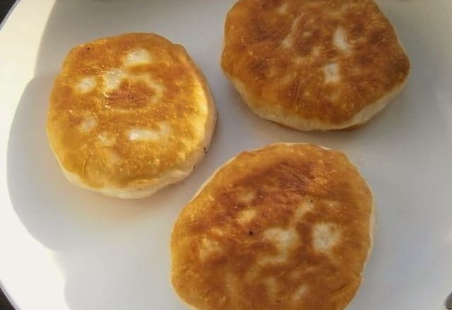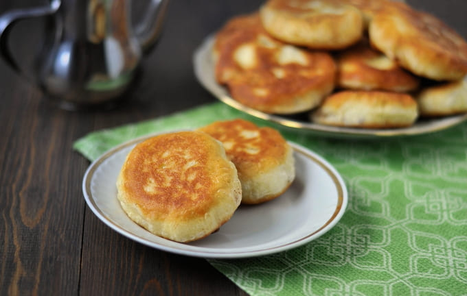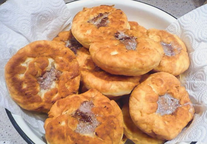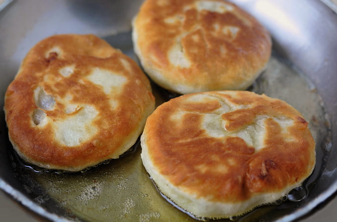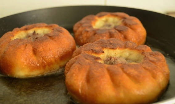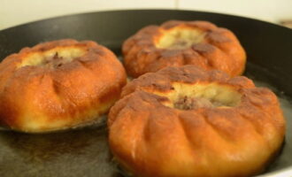 - We vullen de stukken van het voorbereide deeg met gehakt en doen ze in een koekenpan die is voorverwarmd met plantaardige olie. Bak aan beide kanten goudbruin.