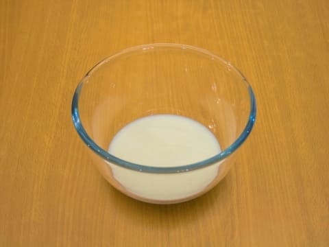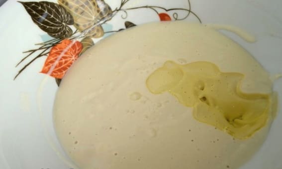 We verdunnen de gist met suiker en warme melk. Je kunt een beetje plantaardige olie druppelen. Roer en laat 5 minuten staan.