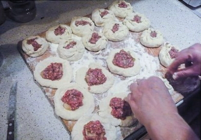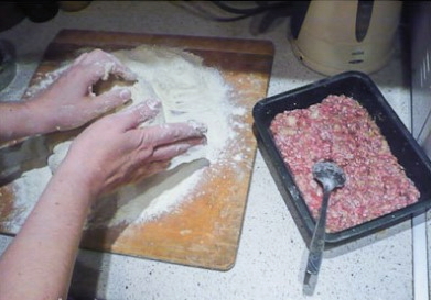 - Meng in een aparte kom het gehakt met zout, zwarte peper en gesnipperde uien. Verdeel het deeg in kleine stukjes.