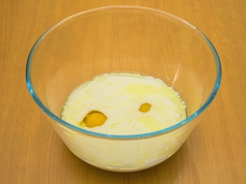 - Giet de resterende kefir in een aparte kom. Hier breken we twee kippeneieren, voegen zout en gesmolten boter toe.