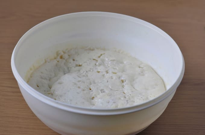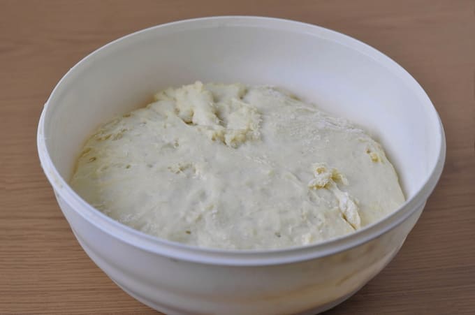 - Giet vervolgens het resterende water erbij, zeef de resterende bloem en voeg de gist toe. Kneed het deeg met je handen glad en laat het 1 uur rijzen op een warme plaats.