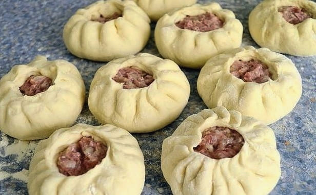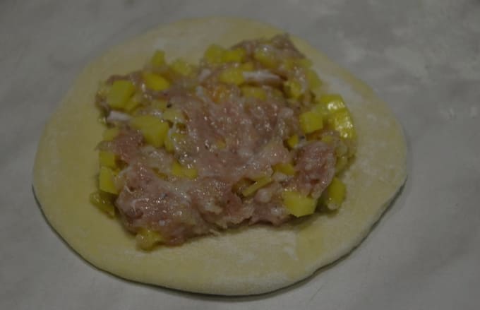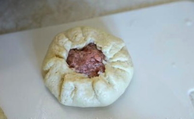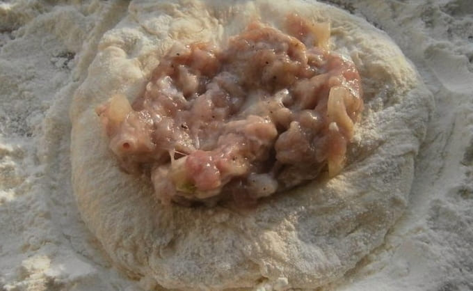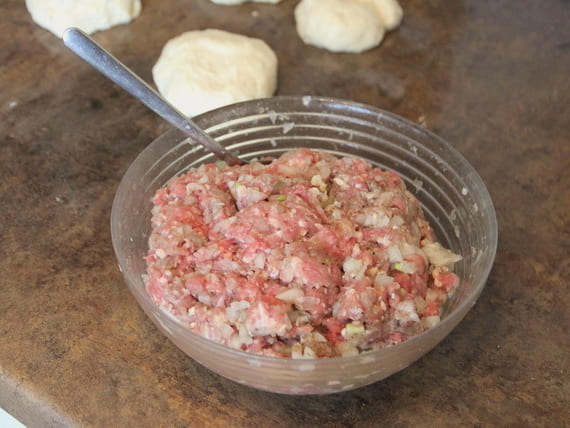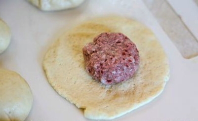 - Rol elke bal deeg in een kleine dikke cirkel. Leg de gehaktvulling in het midden van elke blanco.