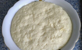 - Voeg deeg en gezeefde bloem toe aan het mengsel. Roer het deeg, dek af met een handdoek en zet het een uur op een warme plaats. Gedurende deze tijd wordt het product weelderig en luchtig.