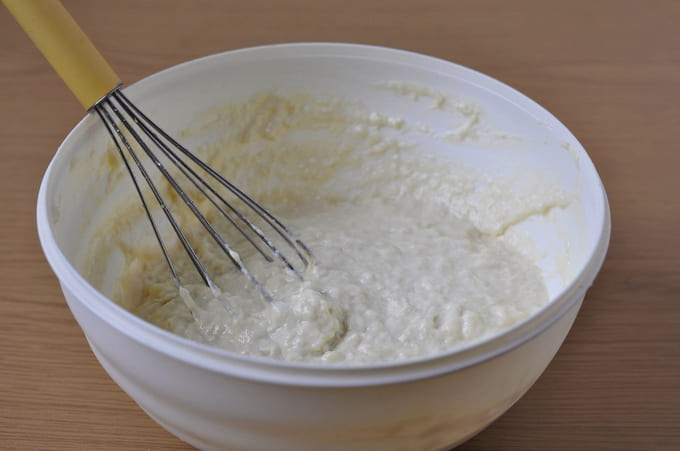 - Combineer het ei met kefir, zout, frisdrank en suiker. Zeef hier de bloem en klop de massa dan goed door. Je zou een dun, stroperig deeg moeten krijgen.