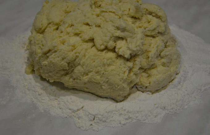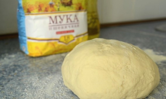 - Leg een stuk luchtig en vloeibaar deeg op tafel, bestrooid met bloem.