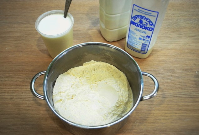 - Zeef voor het deeg de bloem in een diepe kom.Giet hier zout, suiker, frisdrank. Voeg licht opgewarmde melk en boter toe.
