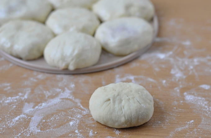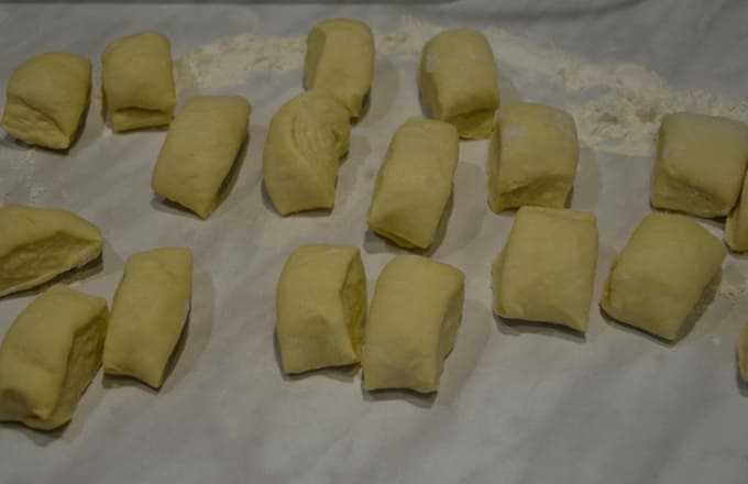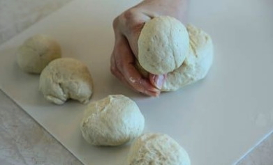 - Verdeel het afgewerkte gistdeeg in kleine stukjes, die we in ballen rollen.
