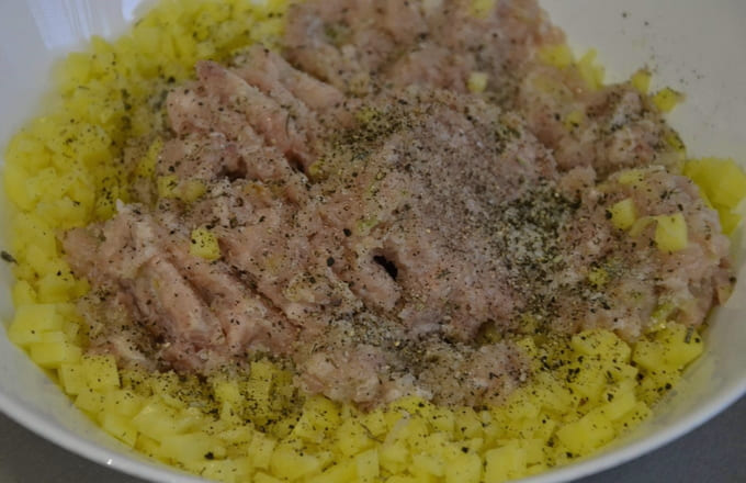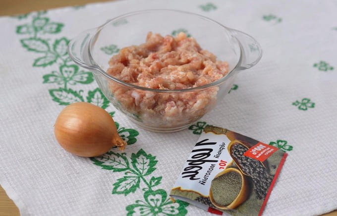 - Op dit moment zullen we de vleesvulling bereiden. Meng ontdooid gehakt kip met zout, gemalen zwarte peper en gesnipperde uien.