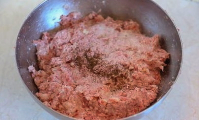 - Gedurende deze tijd bereiden we de vulling voor. Combineer bevroren gehakt met kruiden naar smaak.