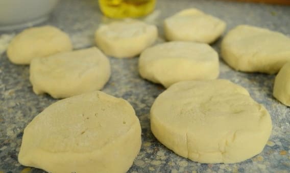 - Kneed het deeg goed tot het elastisch en stevig is. Vervolgens snijden we het in kleine stukjes, waaruit we cirkels vormen.