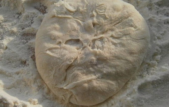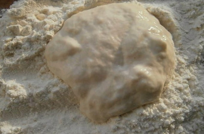 - Giet kefir in een diepe kom. Zeef hier bloem, soda, suiker en zout. Kneed het deeg met je handen tot het stevig en glad is en laat het rusten.
