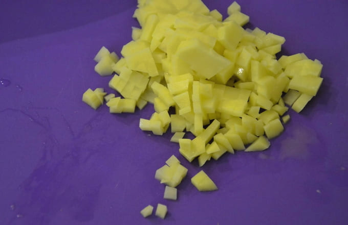 - Op dit moment bereiden we de vulling voor. We reinigen en wassen de aardappelen, snijden ze in kleine blokjes.