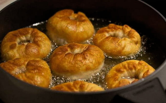- Bak het werkstuk in een pan met verwarmde plantaardige olie. Koken tot een heldere blos.