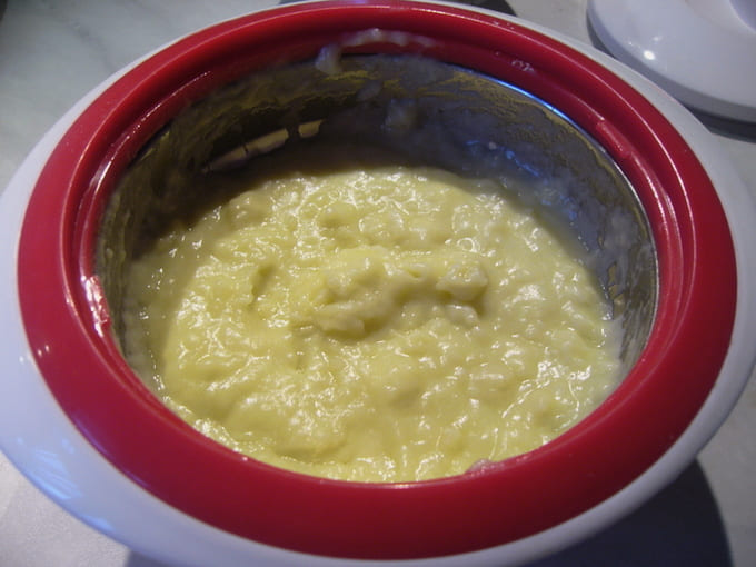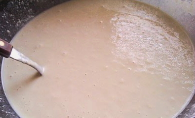 - We verwarmen de melk en gieten deze in de droge massa. Roer met een garde.