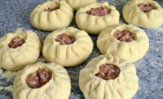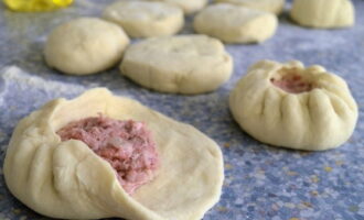 - Rol een kleine strakke cirkel uit elk stuk deeg, in het midden waarvan we het gehakt met kruiden besmeren. We wikkelen de randen van het product.