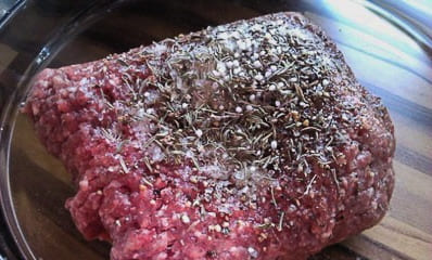 - Bestrooi een stuk ontdooid gehakt met kruiden naar smaak. Dit kunnen droge kruiden zijn of een mengsel van paprika's.