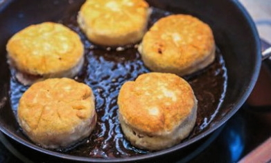 - Verwarm een koekenpan voor met veel plantaardige olie. Bak het product aan beide kanten tot een heldere blos.