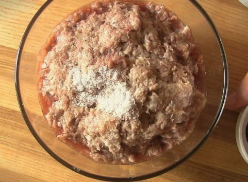 - We gaan meteen de vulling klaarmaken. Meng gehakt, zout, peper en gesnipperde uien in een diepe kom.