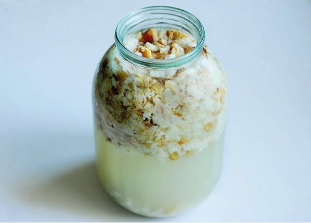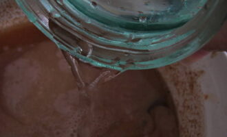 Koel af tot 37 graden en giet er 1 eetlepel zuurdesem in, die we eerder hebben bereid van wijngist en roggemeel.