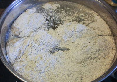 - Giet bloem in een grote kom, giet er 2 kopjes water in en meng alles goed tot een romige staat. Voeg suiker toe en roer het mengsel opnieuw.