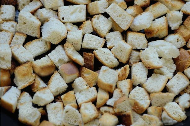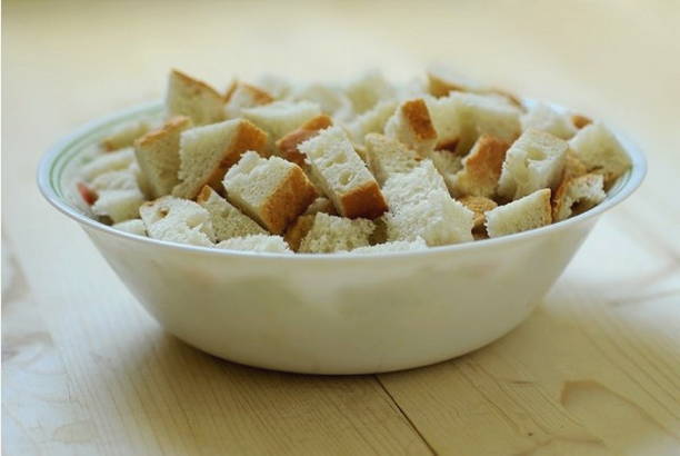 - Snijd het witbrood in blokjes van elk ongeveer 2 centimeter.