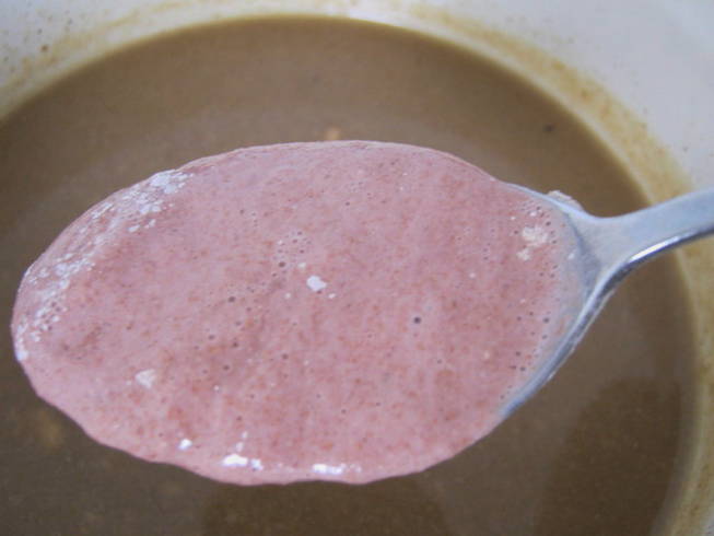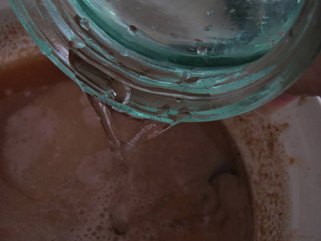 Koel af tot 37 graden en giet er 1 eetlepel zuurdesem in, die we eerder hebben bereid van wijngist en roggemeel.