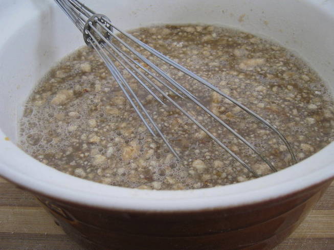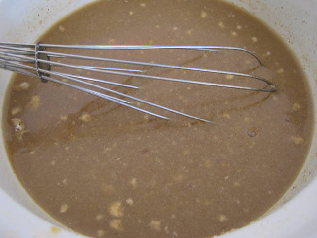 Breek met een garde de klontjes bloem en breng het mengsel tot een homogene massa.