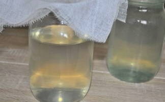 Zeef het berkensap meerdere keren door kaasdoek. We gieten het direct in schone en droge glazen potten.