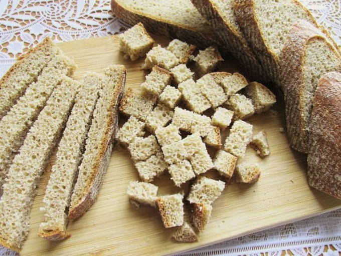 - Verdeel de sneetjes roggebrood in kleine blokjes. We leggen ze in een vorm of een bakplaat, bakken in een voorverwarmde oven op 180 graden gedurende 15 minuten.