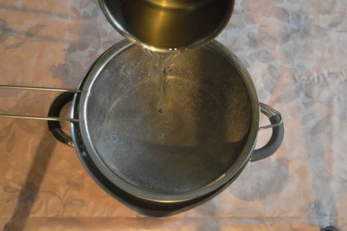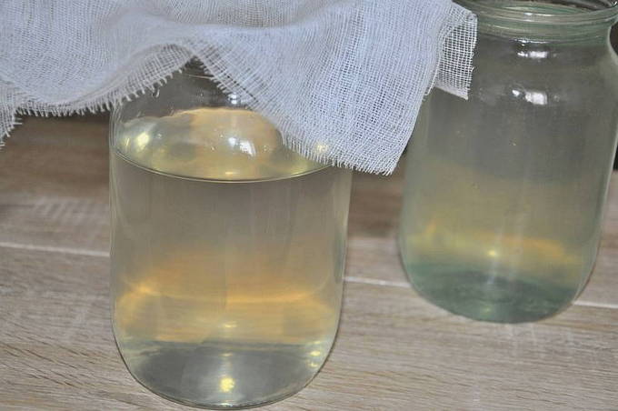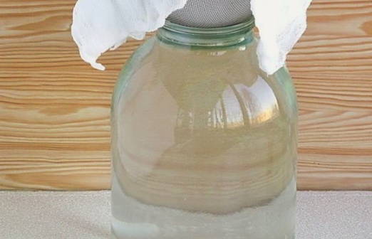- Filter het berkensap grondig door een fijne zeef of schoon gaas dat meerdere keren is gevouwen. De procedure kan meerdere keren worden herhaald.