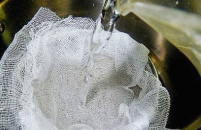 - Filter het berkensap apart door kaasdoek. We herhalen de procedure meerdere keren.