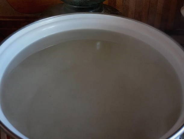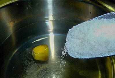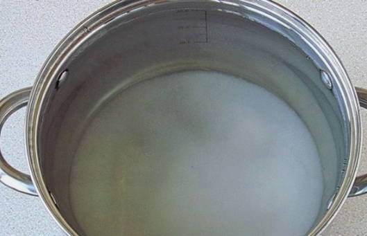 - Combineer het bereide product met suiker in een pan. Roer en breng aan de kook. Het droge ingrediënt moet volledig oplossen in de vloeistof.