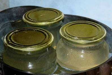 - Giet heet sap in gesteriliseerde glazen potten. We sluiten ze af met deksels en doen ze in een grote pan met kokend water. We houden ze daar gedurende 10-15 minuten.
