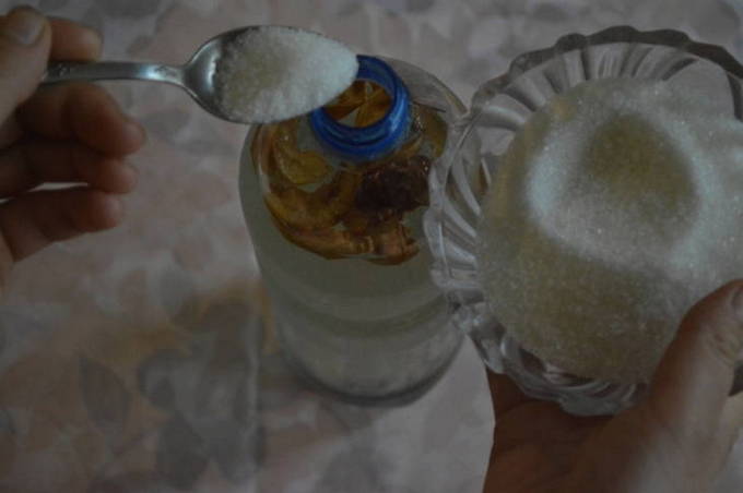 - Doe de voorgewassen rozijnen, gedroogde appels en suiker in dezelfde fles. Draai het deksel stevig vast, schud en laat 3-4 dagen op een warme plaats staan.