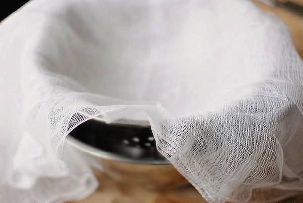 - Zeef eerst het berkensap. Hiervoor kun je de kaasdoek meerdere keren vouwen.