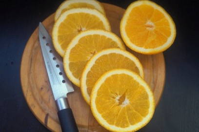 - We wassen de helft van de sinaasappel en verdelen deze in dunne cirkels. De botten kunnen vooraf worden verwijderd.