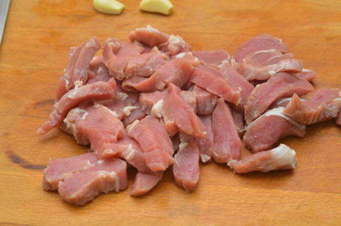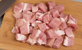 We wassen het varkensvlees, reinigen het vlees van witte strepen en snijden het in kleine blokjes.