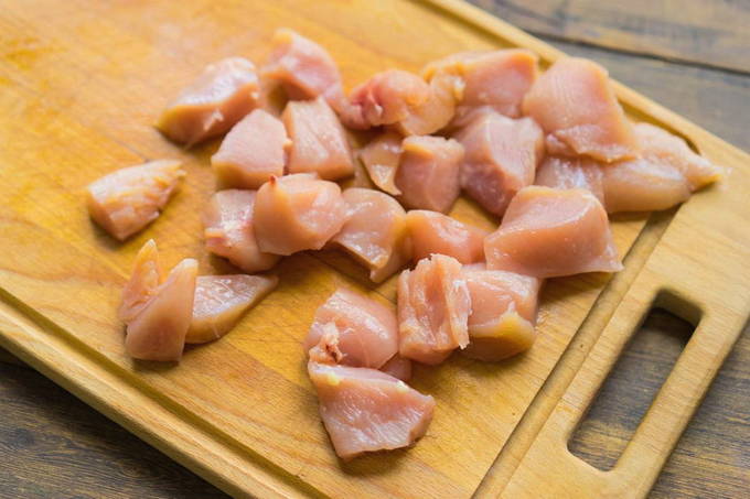 - Was de kipfilet en snijd deze in middelgrote stukken zodat ze lekker in de schaal liggen.