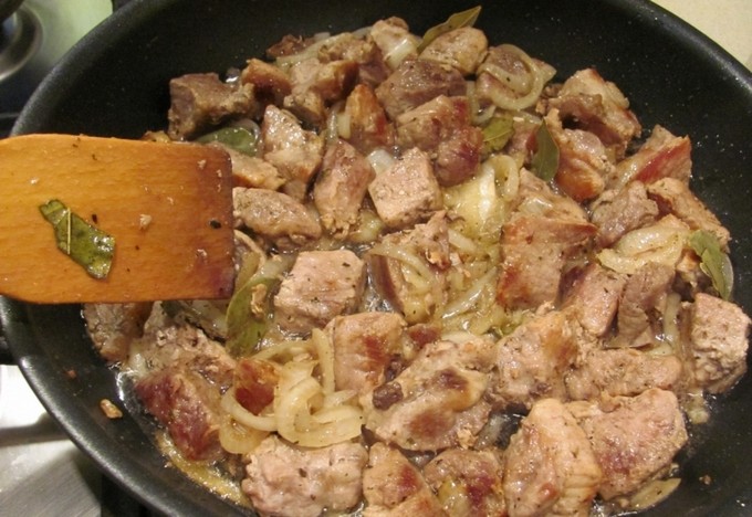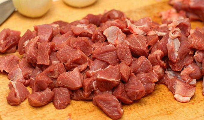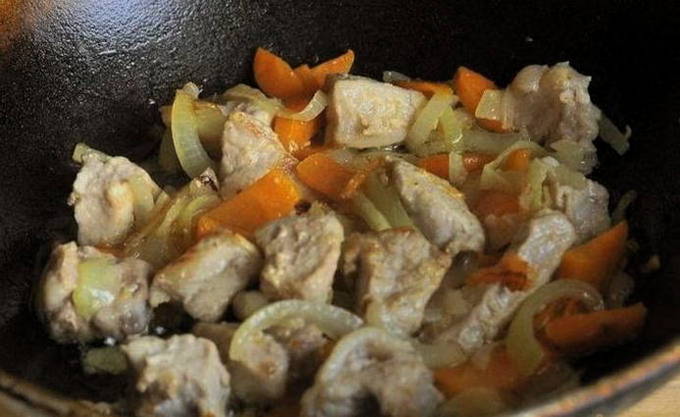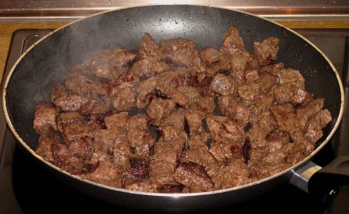 - Snijd het vlees in kleine blokjes, bak het in hete plantaardige olie.