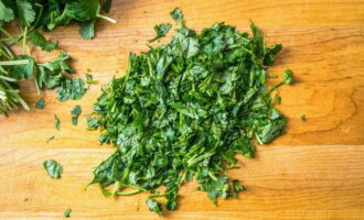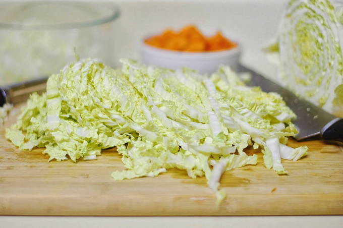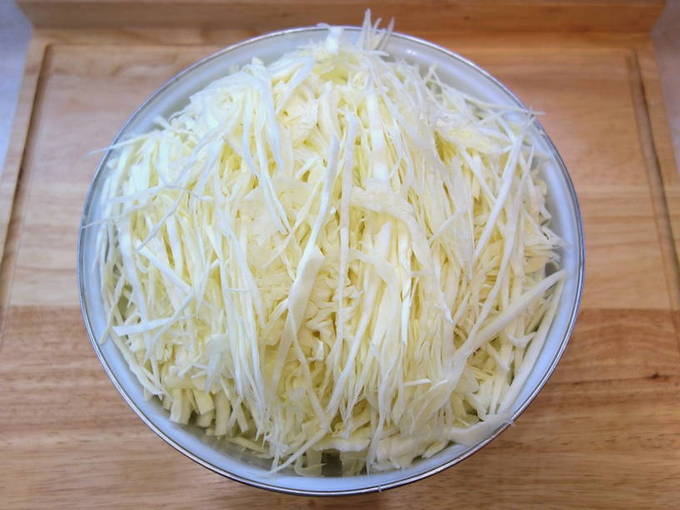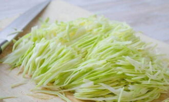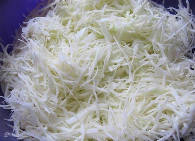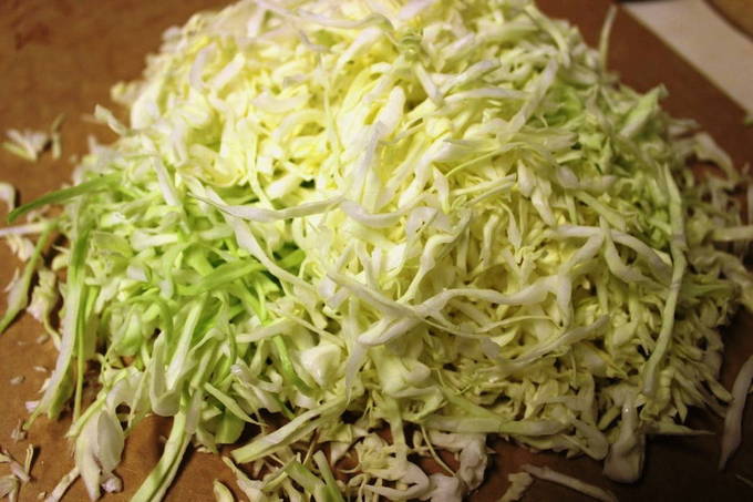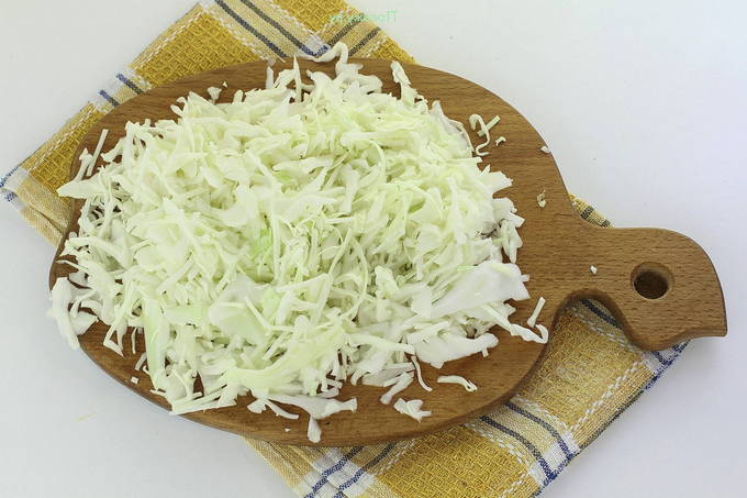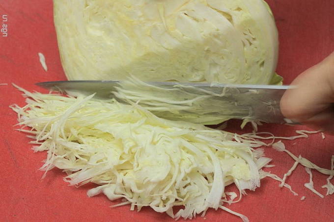 - Op dit moment zullen we de kool bereiden. Het moet worden gewassen en fijn worden verkruimeld met een breed mes.