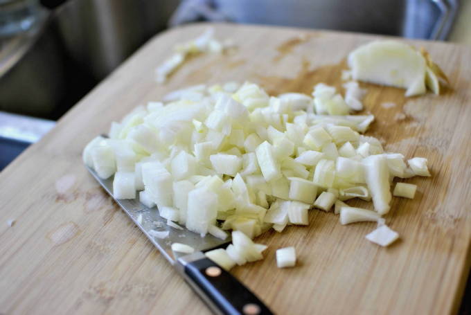- Schil en snij de ui in blokjes.