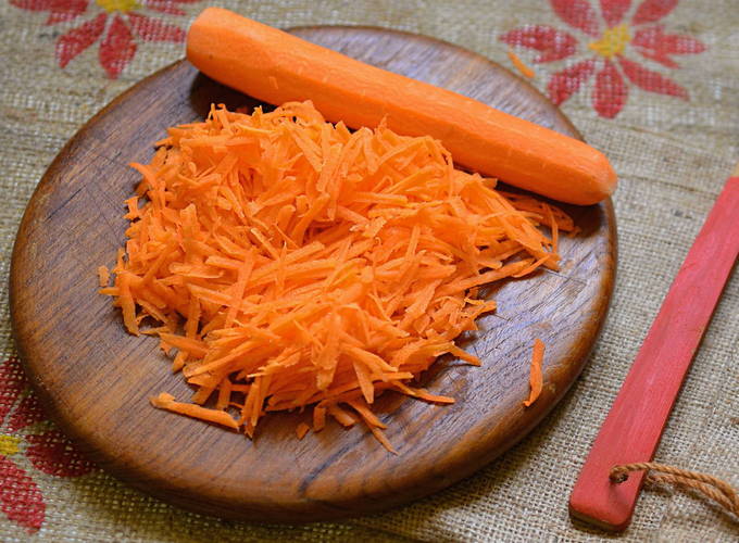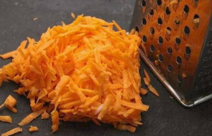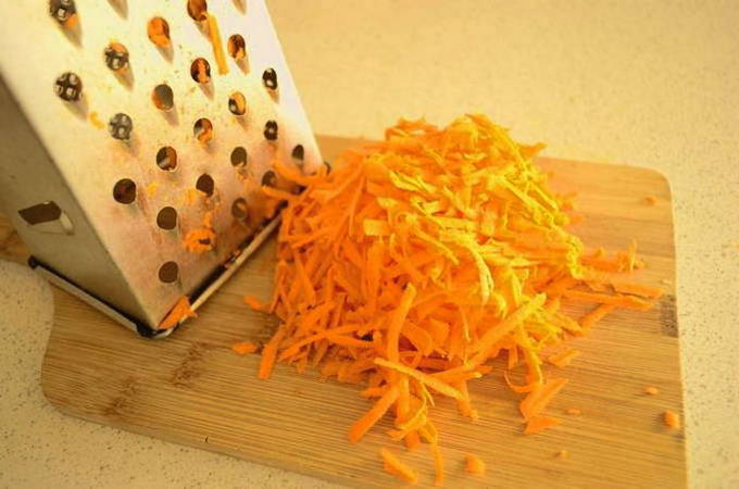 - En na het schillen van de wortelen, rasp ze met grote vlokken.