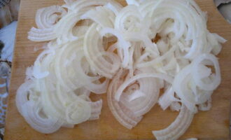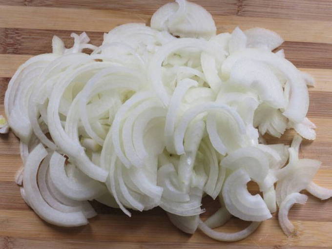 We maken de ui van de schil schoon, snijden hem in halve ringen.