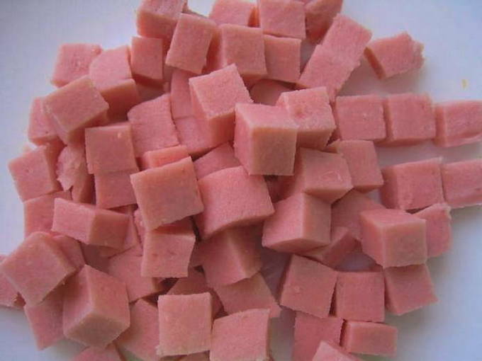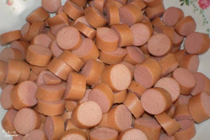 - Snijd de worst in kleine blokjes.