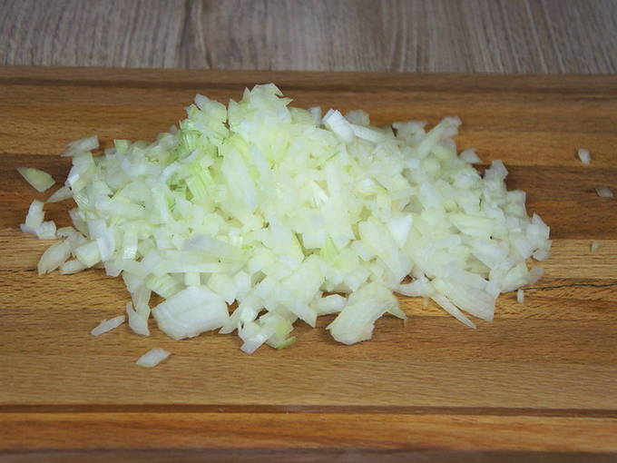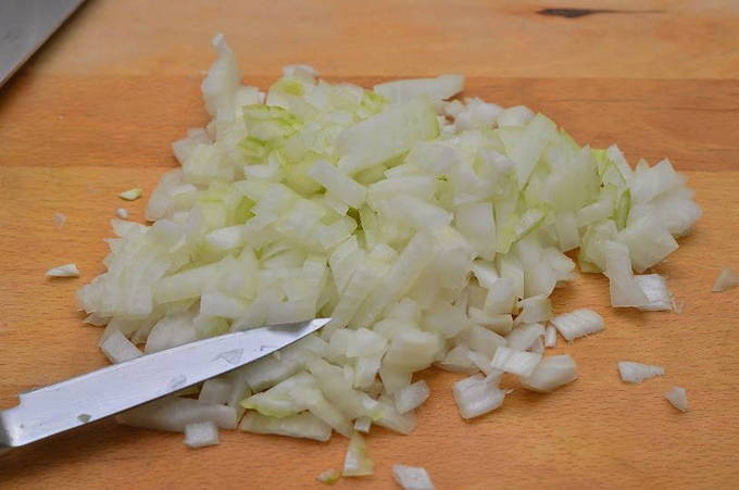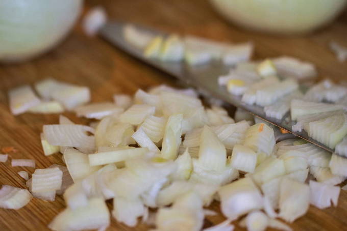 - Schil de ui, snijd hem in blokjes.
