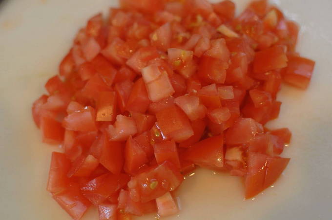 - Mijn tomaat, verwijder de bladsteel en snijd hem in stukjes.