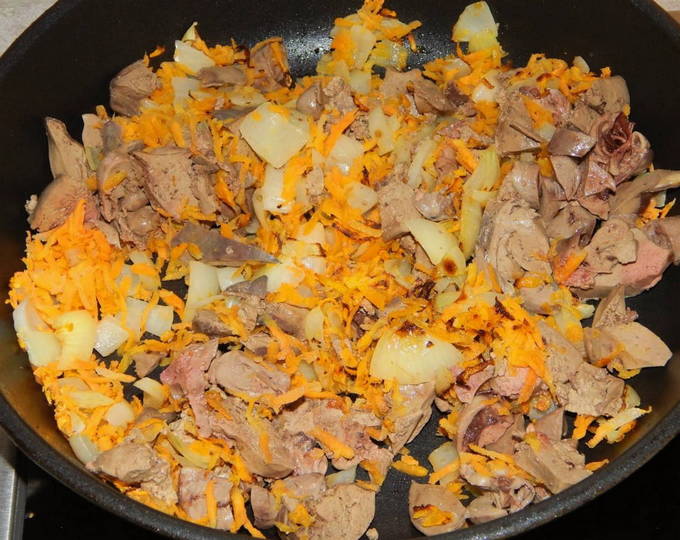 - Verwarm een koekenpan voor met plantaardige olie en leg de stukjes kip, uien en wortelen erop. Bak 10-15 minuten, af en toe roeren.